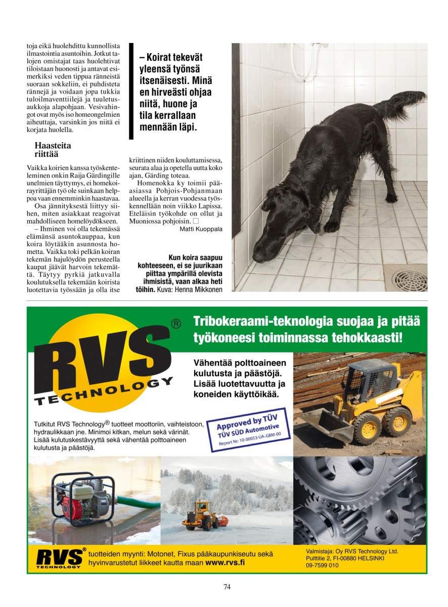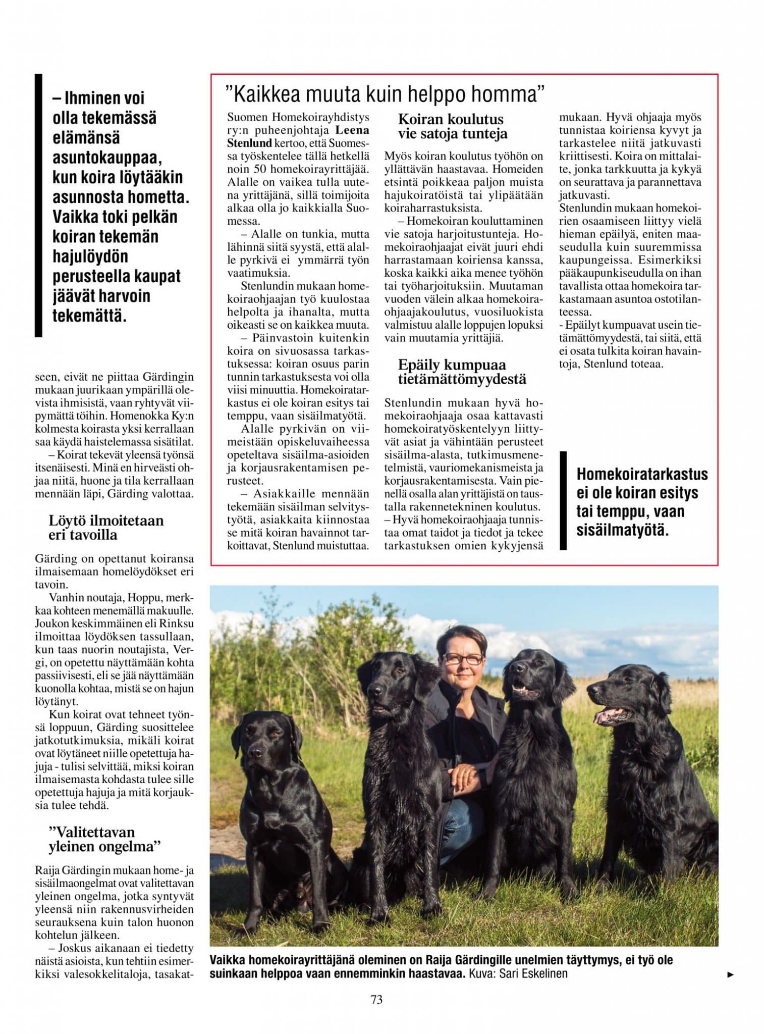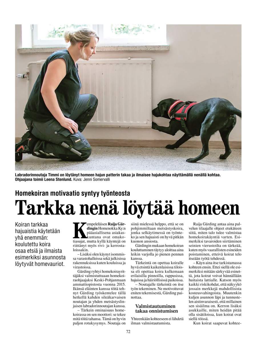 Uusimmassa Kiinteistö ja Energia -lehdessä homekoiratyötä esiteltiin taas kahden yrittäjän näkökulmasta. Kempeläinen Raija Gärding tekee neljän noutajansa kanssa homekoiratyötä, tarkastaen asuntoja, kouluja ja virastotaloja.
